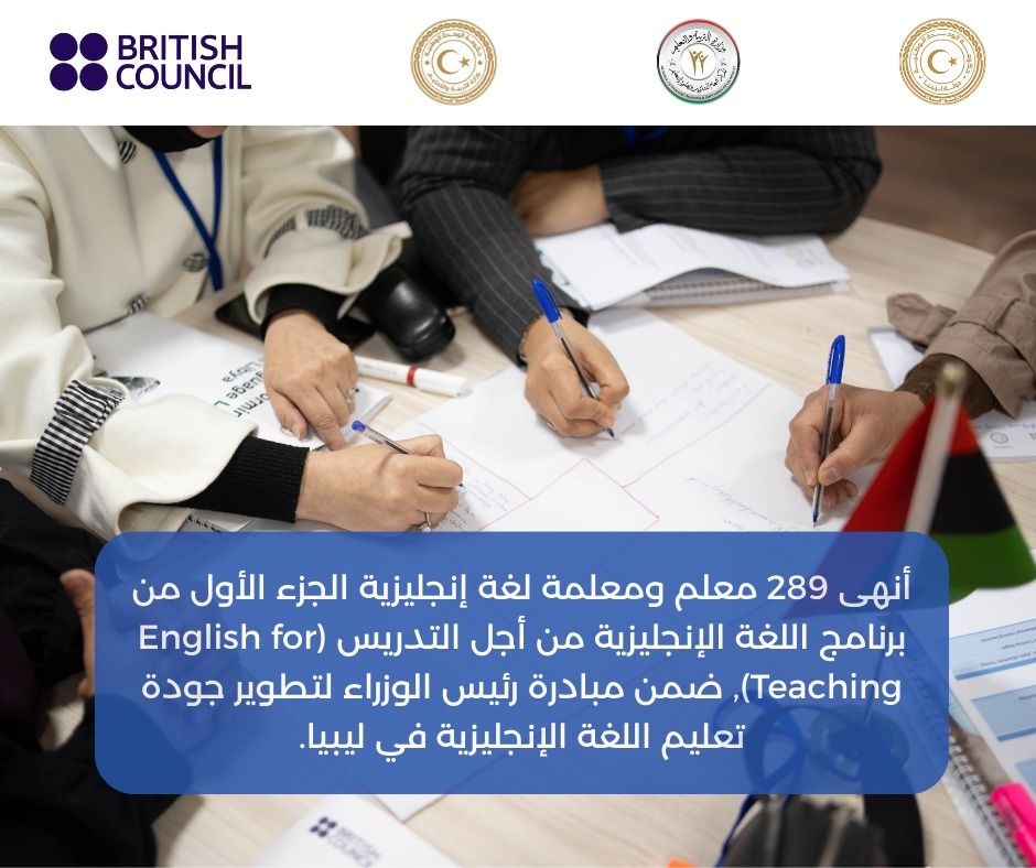 في 23 يناير 2026، أنهى 289 معلماً ومعلمة لغة إنجليزية من الدفعة الثانية بنجاح الجزء الأول من برنامج اللغة الإنجليزية من أجل التدريس (English for Teaching)، وذلك ضمن المبادرة الوطنية الهادفة إلى تطوير تعليم اللغة الإنجليزية في ليبيا.