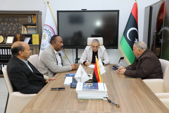 اجتماع مدير عام المركز العام للتدريب وتطوير التعليم، الدكتور محمد إبراهيم غومة، مع المدربين الأستاذ خميس مؤمن والأستاذ محمد خليل، بحضور مدير إدارة التخطيط بالمركز السيد محمد العجيلي.