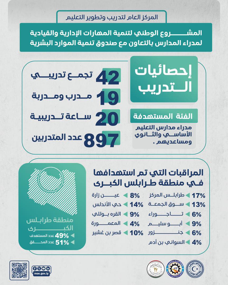 الإحصائية التدريبية للمشروع الوطني لتنمية المهارات الإدارية والقيادية لمديري المدارس ومساعديهم بمراقبات التربية والتعليم في منطقة طرابلس الكبرى بمرحلتي التعليم الأساسي والثانوي، حيث بلغ عدد المشاركين 897 متدربًا من أصل 1941.