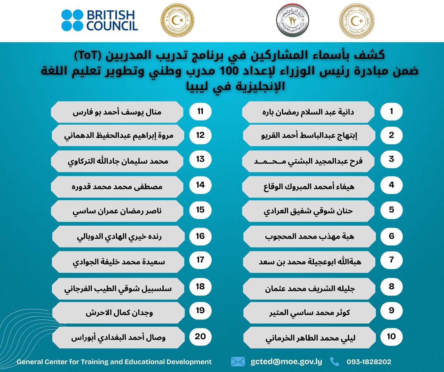 وتضم هذه المجموعة الافتتاحية 20 معلماً ومعلمة، تم اختيارهم من خلال عملية تنافسية شملت التقديم والمقابلات، ونُفِّذت بدعم من وزارة التربية والتعليم، ومراقبات التربية والتعليم، والهيئة العامة لتطوير التعليم التقني (GCTED)، التي قدّمت أيضاً الدعم للمعلمين خلال مرحلة التقديم. وتمثل هذه الخطوة البداية نحو بناء مجموعة وطنية #تضم 100 مدرب وطني، وذلك ضمن مبادرة رئيس الوزراء لإعداد 100 مدرب وطني وتطوير تعليم اللغة الإنجليزية في ليبيا.
