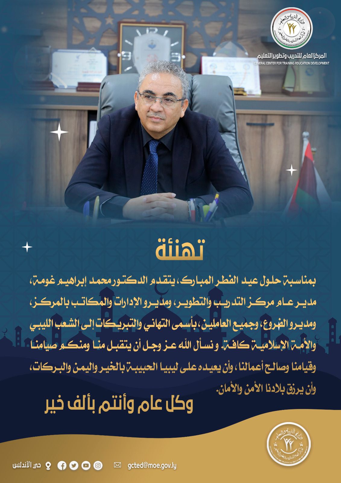 يتقدّم مدير عام المركز العام للتدريب وتطوير التعليم، الدكتور محمد إبراهيم غومة، بأصدق التهاني والتبريكات إلى كافة العاملين بالمركز، وإلى الشعب الليبي والأمة الإسلامية، بمناسبة حلول عيد الفطر المبارك، وكل عام وأنتم بخير.